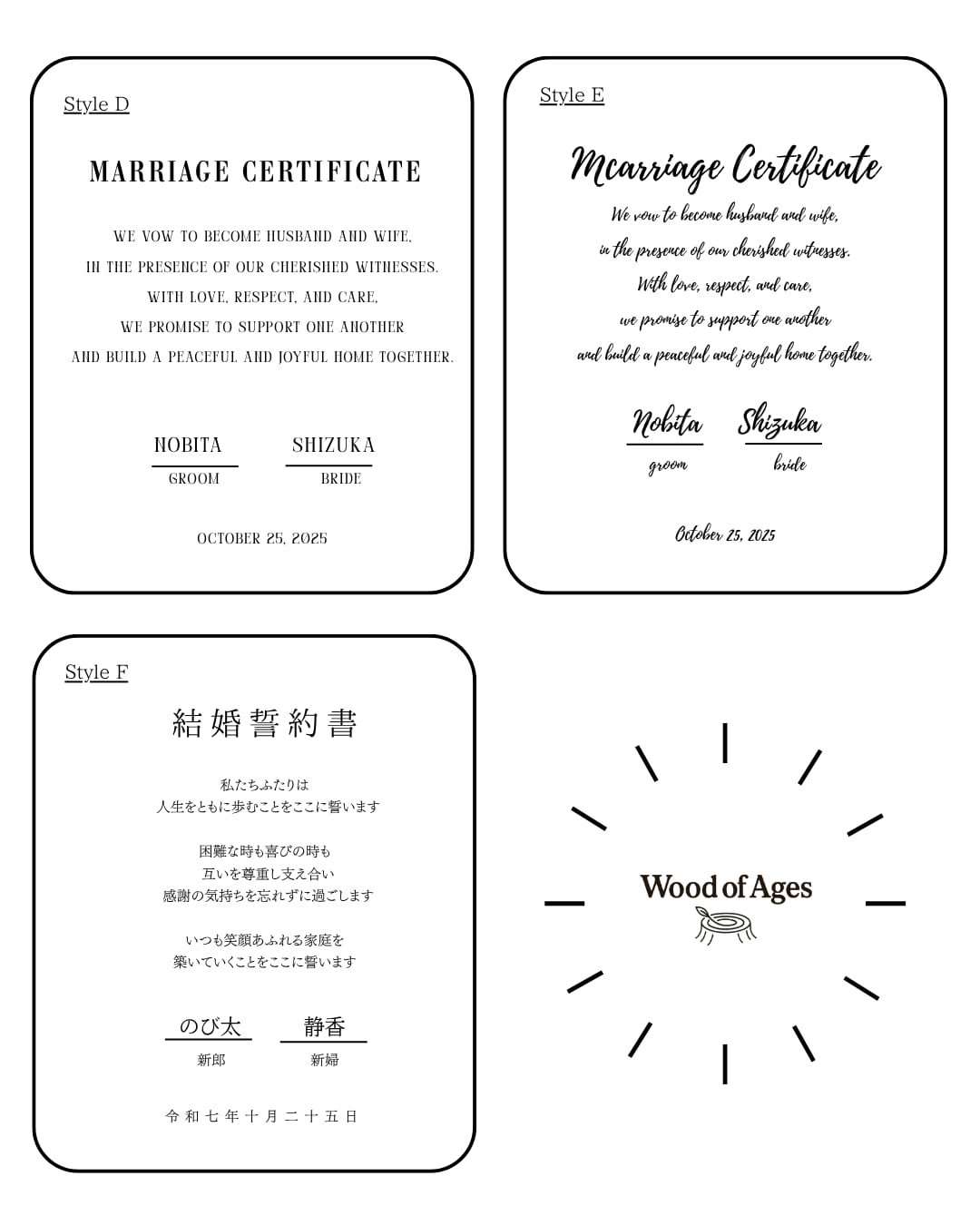 ご注文に際しては、お好みのフォントをお選びいただくことができます。また、刻印する文章は、おひとりおひとりのご希望に合わせてカスタマイズが可能です。
